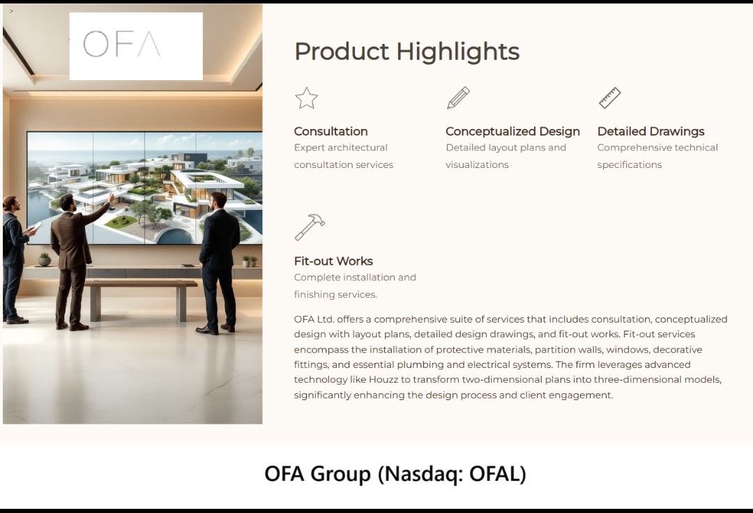 ROLLING HILLS ESTATES, Calif. - AkGlobe -- OFA Group (N A S D A Q: OFAL), through its wholly owned subsidiary Office for Fine Architecture Limited, is redefining the future of architectural services and real estate development by seamlessly merging traditional design excellence with breakthrough AI-driven innovation. With multiple growth vectors โ including a newly launched AI platform, strategic acquisitions, a $100M capital raise, and a pivot toward real estate backed by tangible assets โ OFAL is positioning itself at the intersection of architecture, technology, and digital finance.